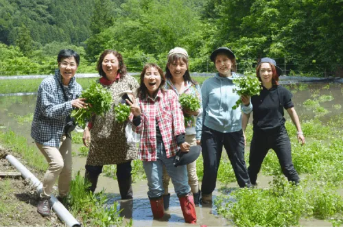 海や海産物のイメージが強い大槌町ですが、実は町の面積の9割以上が森林で、山あいの集落にはどこか懐かしい味わいのある民家や小さな田畑が並びます。そんなのどかな金澤集落の耕作放棄地を活用しクレソンを栽培しているのが「日本クレソン協会 かねざわクレソンヌ」の4人組。笑い声が絶えないパワフルな彼女たちの活動の原動力は「生まれ育った金澤のお年寄りに元気になってほしい」という強い思いです。