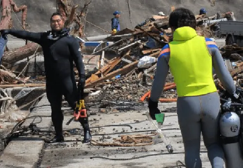 震災から間もない三陸の浜は、津波で流された建物のがれきで埋め尽くされ、行方不明者の捜索も続いていました。養殖施設や定置網の復旧の目途も立たない状況で、各地から「海中のがれき撤去に力を貸してほしい」と頼まれ、潜るように。住宅の屋根や小屋など湾内に沈んだがれきにロープを回し、大勢の漁師たちとともに引き上げるボランティアを始めました。