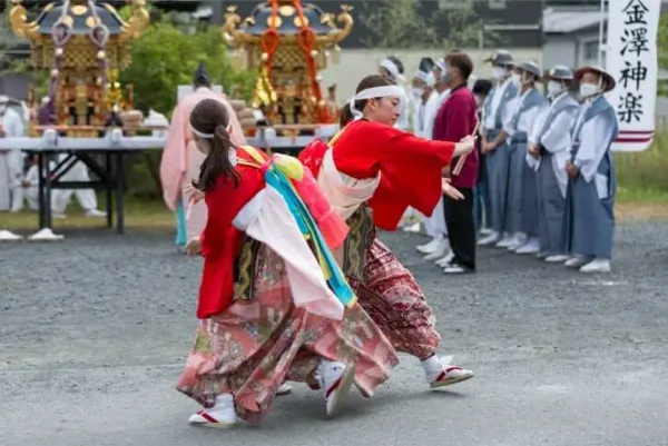 太鼓や笛の囃子に合わせて激しく跳ね回る虎舞や、力強く鹿頭を振って勇壮に踊る鹿子踊……男性が前面に出る芸能が多い大槌にあって、女性たちによる金澤神楽は一度観たら忘れることのできない印象的な舞い。烏帽子をかぶり、扇子や鈴を掲げて舞うさまは、躍動感がありながら、品があり優美です。