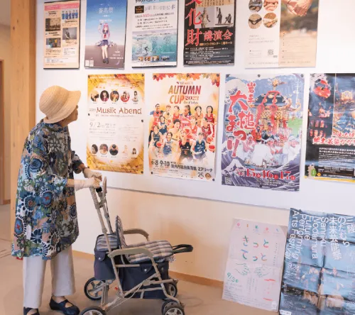 鮮やかなグリーンのブラウスを身につけ、さわやかな装いでおしゃっち(大槌町文化交流センター)のエントランスホールに入ってきたテルさん。すぐ近くの災害公営住宅で暮らすテルさんは、毎日午後2時くらいになると、おしゃっちの3階にある町立図書館に来て、その日の全国紙や地方紙に目を通します。震災の翌年から約10年間、専用のノートに新聞のコラムを書き写す日課を欠かすことはありませんでした。